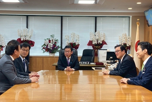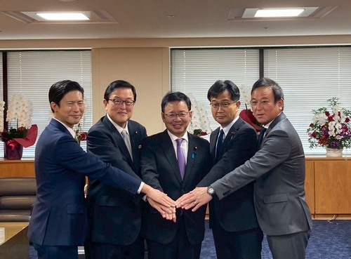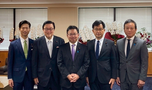 上野賢一郎大臣を囲み、長坂副大臣、仁木副大臣、神谷大臣政務官、栗原大臣政務官の政務三役